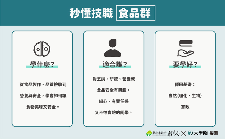 發佈日期:技高的「食品群」,並非只是學做料理,而是訓練未來的「食安守護者」與「美味創造師」。課程內容結合科學、技術與創意,教你如何把農漁產等食物原料,經過加工、檢驗、包裝,變成各種美味又安全的食品,如罐頭、飲料、零食、糕點等。如果你對食物的來源、成分、加工過程充滿好奇,喜歡動手做點心、研究如何讓食物美味又安全,那食品群是個能讓你發揮所長的選擇。