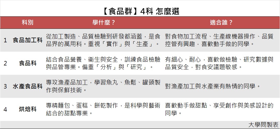 食品群包括:食品加工科、食品科、水產食品科、烘焙科,專攻領域不同。